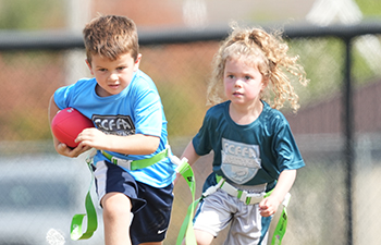* One coach on offense and one coach on defense will have a whistle. Only blow the whistle when the kid scores a TD or if the ball is fumbled. If the player falls down or Even if the player's flag is pulled, let them get up and make it to the endzone! Each team can have (at the most) two coaches on the field. On offense, the 2nd coach should stand in the endzone as a point of destination for the kids to run to. |